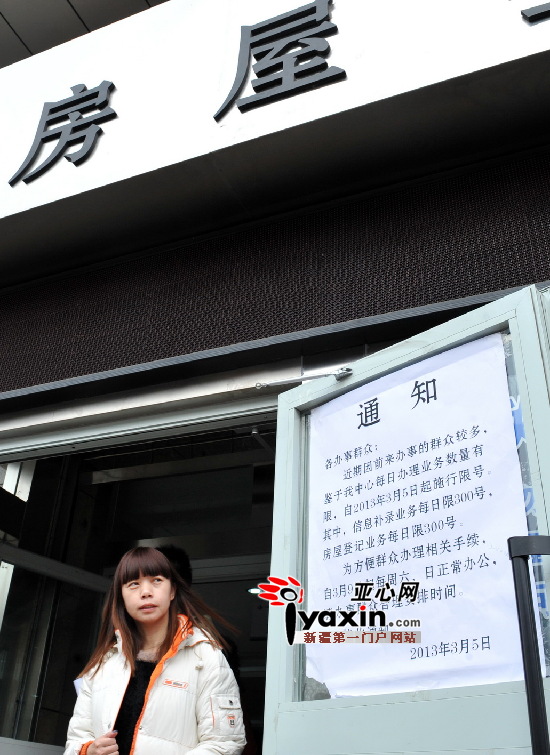 圖為 10日12時,烏魯木齊房產交易中心門前張貼著限號的通知,前來辦理業(yè)務的市民絡繹不絕。記者 李瑞 攝